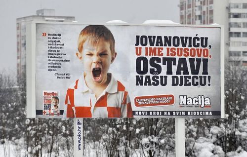 Istodobno su na ulicama Zagreba osvanuli jumbo-plakati s ljutitim dječakom odjevenim u majicu s crveno-bijelim hrvatskim kockicama, sa sloganom "JOVANOVIĆU, u ime Isusovo, ostavi našu djecu!".