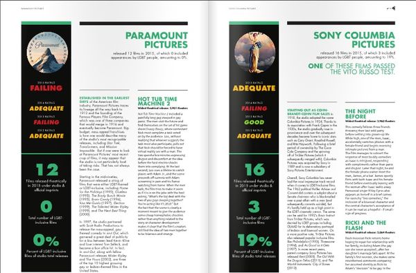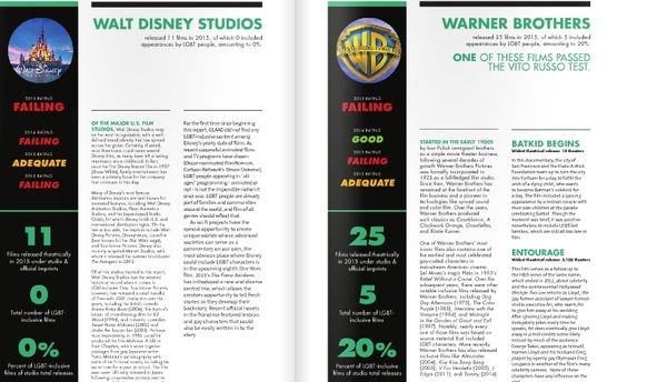 U samo 17,5 posto od ukupno 126 velikih filmova prikazanih u 2015. vidjeli smo LGBT likove, što je jednako rezultatu prošlogodišnjeg izvješća, međutim očigledan je pad u kvaliteti prikaza tih likova ocjenjuje se u izvještaju.