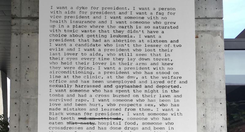 Pjesma "I want a Dyke for President" ("Hoću lezbu za predsjednicu") umjetnice i aktivistkinje Zoe Leonard, postavljena je na jednom njujorškom panou. Pjesma je napisana 1992. godine, a svim građankama i građanima SAD-a šalje moćnu poruku.
