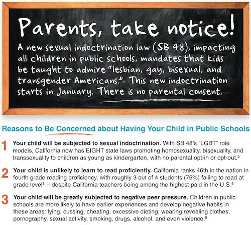 Guverner Jerry Brown u srpnju je potpisao Senate Bill 48, zakon koji treba stupiti na snagu 1. siječnja 2012. godine, a njime se regulira novi način učenja povijesti u školama. Tako bi djeca na satovima učila kako su američkoj povijesti pridonijele LGBT osobe te druge etničke i društvene manjine.