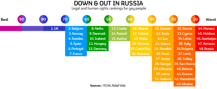 Očekivano, Rusija je zauzela posljednje mjesto zbog antigej zakona uvedenih prošle godine, zadovoljivši kriterije s tek sedam posto. S druge strane, Ujedinjeno Kraljevstvo našlo se na vrhu ljestvice, s visokih 77 posto.