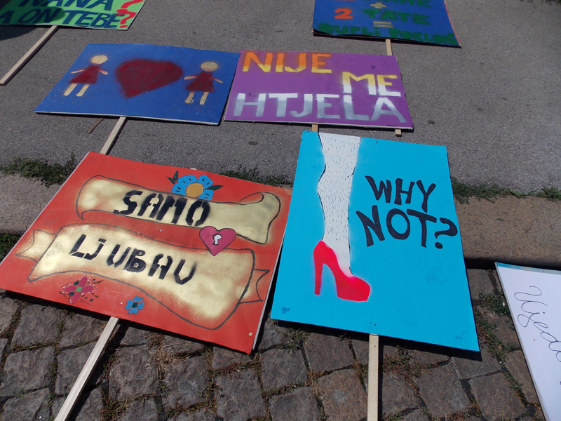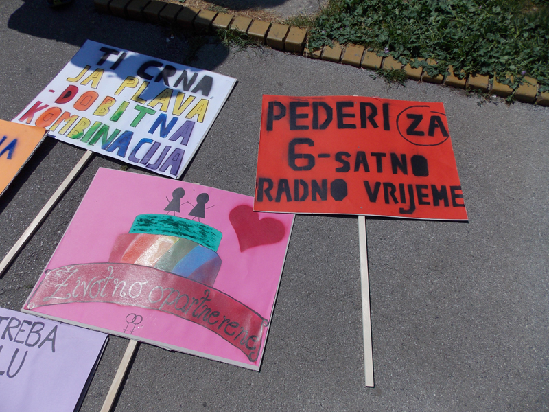 Među brojnim transparentima u povorci u kojoj je sudjelovalo nešto više od 5000 ljudi, kako tvrde inicijalne procjene, istaknuli su se sljedeći natpisi: "Pederi za šestosatno radno vrijeme", "Dvije mame + dvije tate = dupli poklon", "Oprosti, znaju što čine", "Zajedno u Kvirstvu", "Na margini danas, u otporu sutra, a u slobodi vječno" te "Ljubio sam Sašu na salašu".