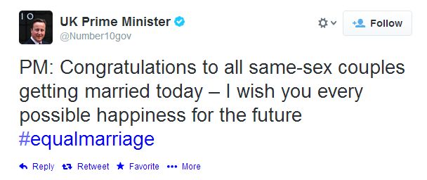"Ovog vikenda obilježava se poseban trenutak za našu zemlju. Prvi put u povijesti, brak će moći sklopiti ne samo muškarac i žena već i muškarac i muškarac te žena i žena. Nakon dugotrajne kampanje, konačno imamo bračnu jednakost. U Britaniji više neće biti važno jeste li gej ili strejt. Država će se potpuno jednako odnositi prema vašoj vezi.