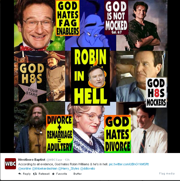 Nakon što je vijest o iznenadnoj smrti glasovitoga glumca Robina Williamsa obišla svijet, svoju priliku za pet minuta "slave" pokušavaju iskoristiti i pripadnici radikalne baptističke Crkve Westboro, poznate po širenju patološke mržnje prema LGBT osobama.