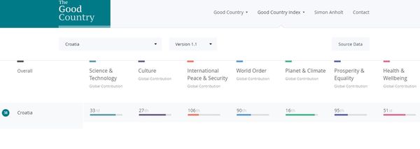 Prema indeksu Good Coutry, kojim se procjenjuje doprinos neke zemlje na život planeta i čovječanstvo, na prvom mjestu od ukupno 163 zemlje našla se Švedska, ponajviše zahvaljujući doprinosu pozitivnom načinu življenja na globalnoj razini, uključujući blagostanje, jednakost, zdravlje i dobrobit. Hrvatska je pozicionirana na 38. mjestu tablice, a na zadnjem mjestu nalazi se Libija.