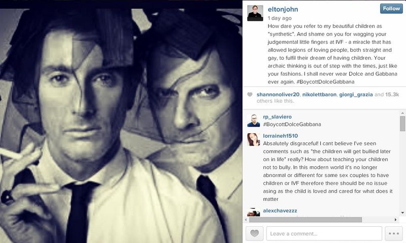 Elton John i njegov suprug David Furnish postali su roditelji 2010. i 2013. zahvaljujući surogat-majci iz SAD-a. Reagirajući na intervju dizajnerskog dvojca napisao je na Instagramu: "Kako se usuđuješ moju djecu nazvati 'sintetičkom'...I srami se zbog svoje jadne osude MPO – čuda koje je omogućilo čitavoj legiji strejt i gej zaljubljenih ljudi da ostvare san o vlastitom djetetu". Objavu je završio istaknuvši hashtag #BoycottDolceGabbana (bojkotiraj Dolcea i Gabbanu) u čemu ga podržava i aktivist za gej prava Peter Tatchell.
