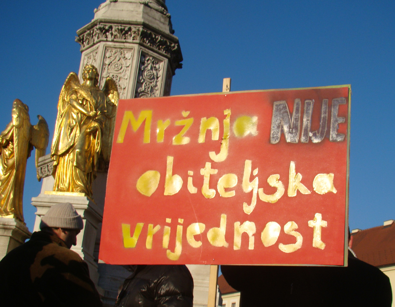 Božić 2012. su LGBT građani Hrvatske dočekali s lecima u svakom Konzumu u kojima ih se proglašavalo bolesnicima, pokrenuta je moćna klerikalna mašinerija – sastavljena od biskupa i fanatičnih klerikalnih i antigej aktivista – da se diskreditira zdravstveni odgoj, i to kroz beskrupulozno demoniziranje pedera i lezbijki, kojima se poricalo i ljudskost i bilo kakvo pravo na postojanje