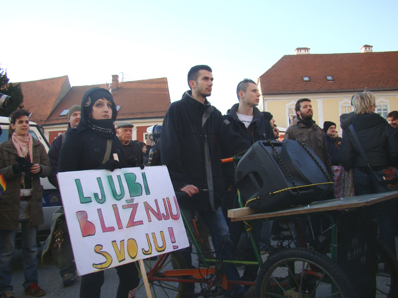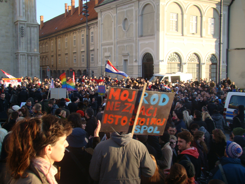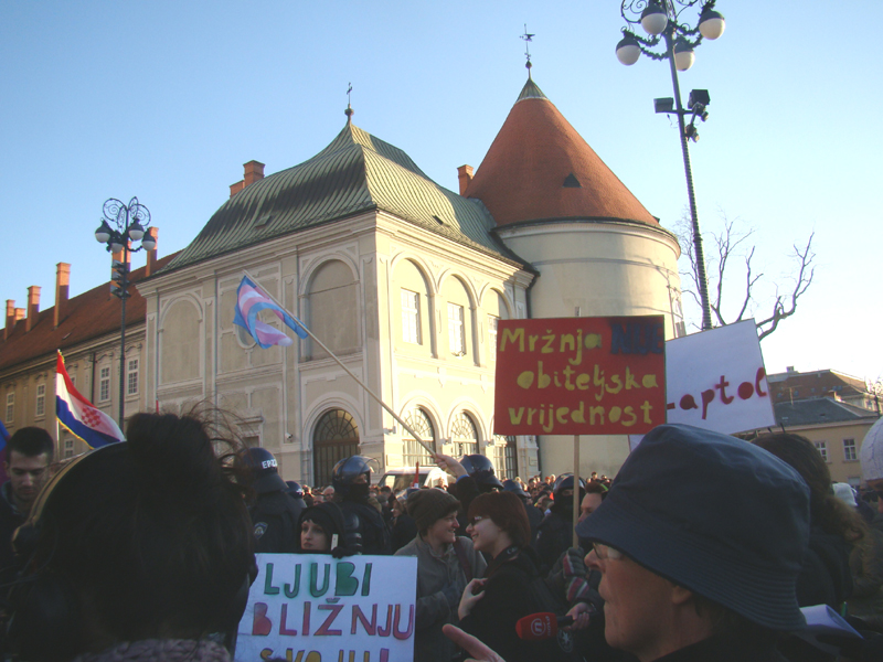 Ipak, došlo je baš oko 100 ljudi, koliko smo unaprijed definirali da želimo okupiti, a među njima su bili i Mile Kekin i Predrag Matvejević. Kekin je došao sa svojim djetetom u kolicima, što katolike iz rulje nikako nije spriječilo da mu prijete nasiljem. Naravno, s druge strane ih se okupilo oko 400-500, malo miroljubivih katolika koji su molili za naše homoseksualne duše, no većinom na nasilje spremne rulje, te i stanoviti Ante Ćorušić, za kojeg sam kasnije doznao da je HDZ-ov kandidat za ministara zdravlja, ako Karamarko i ekipa dođu na vlast. O agresiji i divljačkoj mržnje te rulje ne treba trošiti riječi; uostalom, sve se jasno vidi u videu koji je snimio Viktor Zahtila. Da nije bilo policije, raskidali bi nas stotinjak na komade i plesali delirično na našim leševima uzvikujući "Bog i Hrvati!".