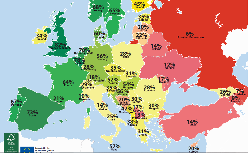 Prosjek Europske unije je 46 posto, što je i dalje ispodpolovična ostvarena zakonska zaštita. Kad se u obzir uzmu i pojedinačni podaci za svaku od država, vidljiv je ogroman nesrazmjer u odnosu prema LGBTI osobama u svakoj od država. Primjer toga je Ujedinjeno Kraljevstvo koje je ostvarilo 82 posto zakonske zaštite LGBTI osoba, dok je druga krajnost Rusija, s tek 6 posto. Hrvatska se ugurala negdje u sredinu s 56 posto. Valja napomenuti i da su 34 od 49 europskih zemalja (uključujući 14 članica EU) ispod 50 posto ostvarene zaštite.
